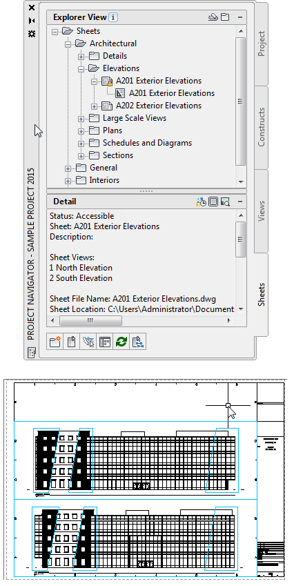 Sheet set, sheets, sheet views, sheet drawings, and model space views are listed on the Sheets and Views tabs of the Project Navigator.