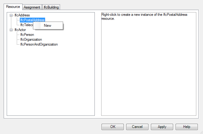 On the left pane of the dialog box, right-click on an IFC resource (for example, IfcPostalAddress) and click New.