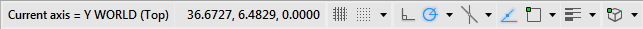 The default active axis is the X axis. The active axis is shown by a broken line extending from the UCS icon origin. To rotate the UCS about the active axis, click and drag the screen pointer perpendicular to the axis. The first pane of the mode status line reports both the active axis and the current rotation, relative to the current orientation.