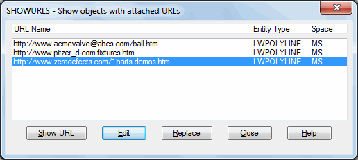 Displays all attached URLs contained in a drawing, and allows them to edited.