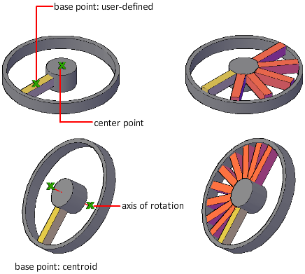 When you create a polar array using the center point, the axis of rotation is the Z axis of the current UCS. You can redefine the axis of rotation by specifying two points.