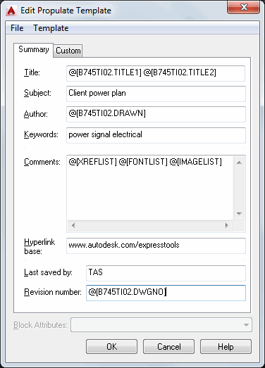 | @[block.attributeTag] | Extracts the attribute tag value from an attributed block and inserts it in the specified field.For example: inserting @[title.drawnby] in the Author field causes Propulate to search the drawing for an attributed block named title, extract the value of the drawnby attribute field, and insert that value in the Author field of the drawing's Drawing Properties dialog box. If common blocks are used across a project it is a simple matter to update a large number of drawings to reflect their specific attribute values. |