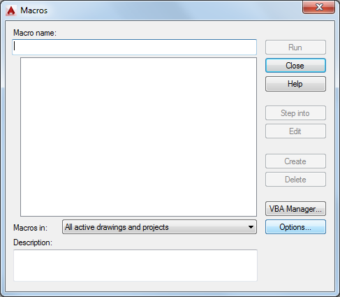 Specifies the project or drawing whose macros are available from the macro list. If your project or drawing is not listed, click VBA Manager to load it.