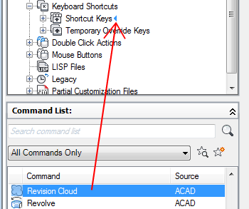 - To create a shortcut key, in the Command List pane, drag a command to the Shortcut Keys node in the Customizations In <file name> pane.