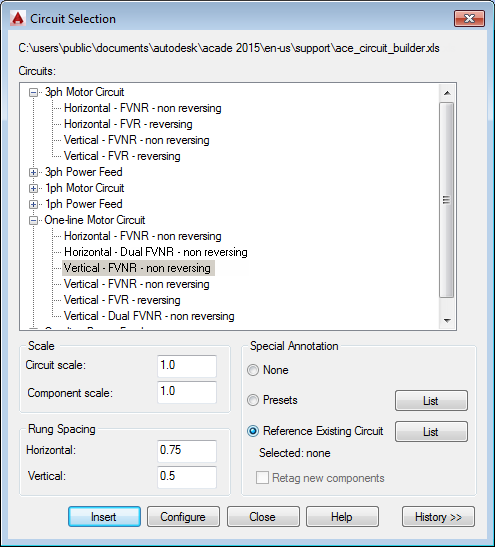 When a new circuit is inserted, you can reference an existing circuit picked from a list of circuits pulled from the active project. The components, values, descriptions, and tag assignments from the selected circuit, become defaults for the new circuit. Tags are recalculated if the option “Retag new components” is selected.