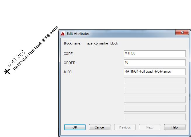 The values generated by this motor setup/annotation function are not automatically written to attributes on the components or wire types on the circuit. These values are saved as an indexed list in an AutoLISP global variable called “#data”. Global means that the data is saved in memory and is available while the Circuit Builder continues to construct the circuit. As Circuit Builder processes subsequent marker blocks of the circuit, it can be set up to pull one or more of these saved values from the global and push them out to attributes on the components or used to format appropriate wiretype layer names