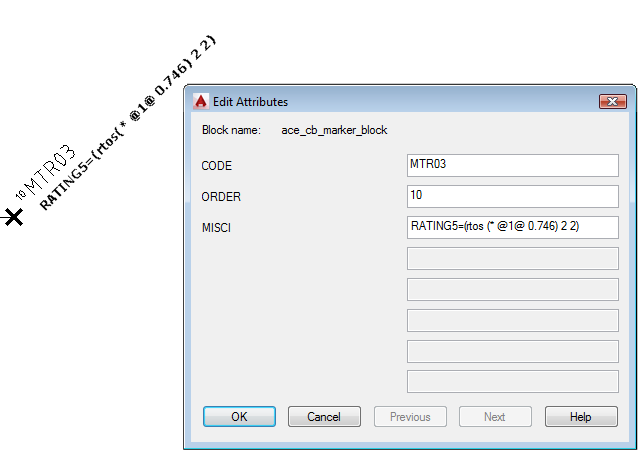 - Edit its MISC1 attribute value using the format “{attribute name}=(AutoLISP expression). For example, convert the HP value to Kilowatts and push this value out to attribute RATING5 on the motor symbol. Enter this expression on the MISC1 attribute of the marker block: