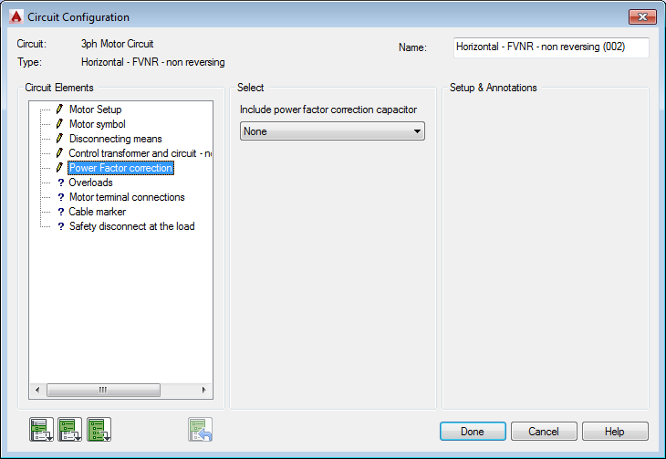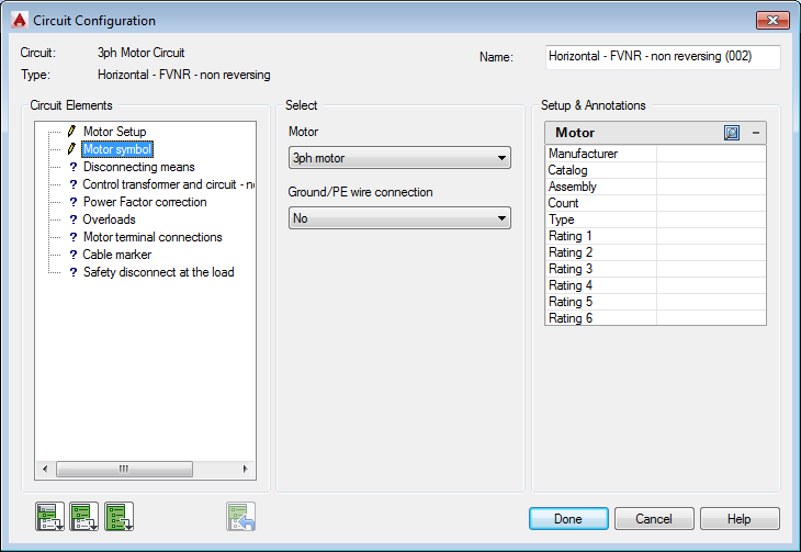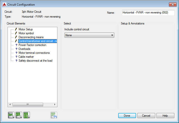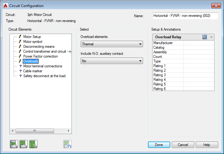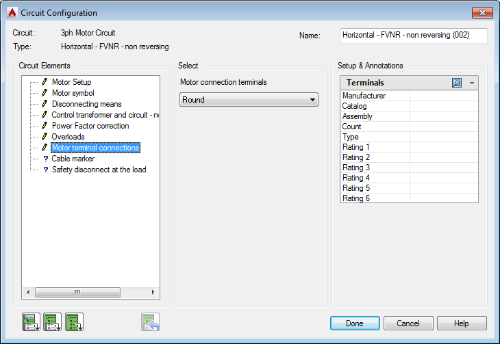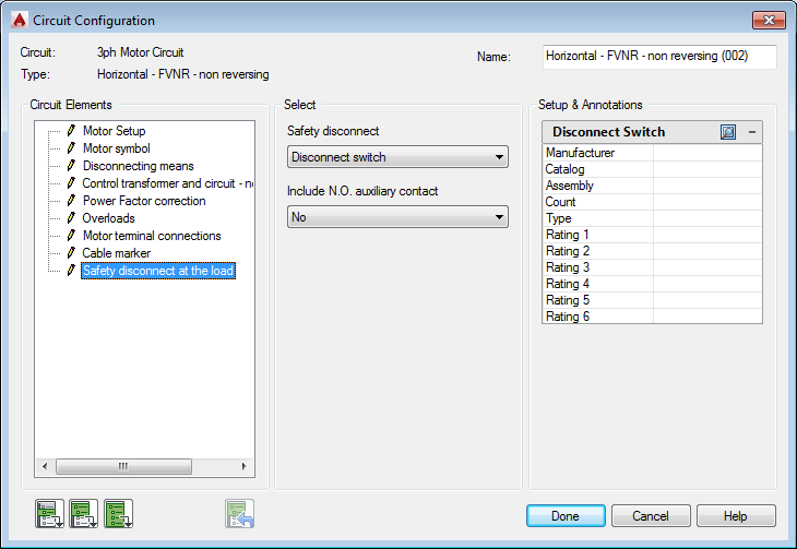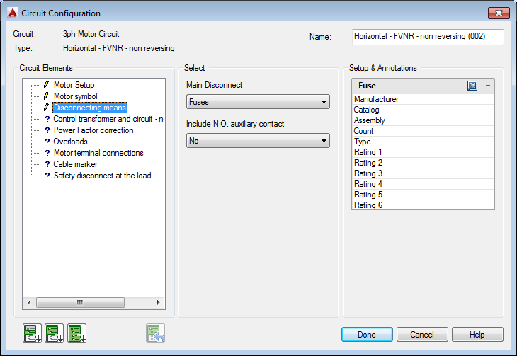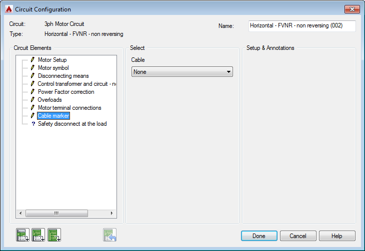 The “marker blocks” control what circuit elements are presented in the Circuit Configuration dialog box. For example, a “marker block” indicates the need for a Disconnecting Means in the circuit. Various options for the Disconnecting Means are presented in the dialog box. The option selected for this circuit element is inserted at the location of the “marker block”. Circuit Builder dynamically builds the complete circuit based on the selections you make on this dialog box.