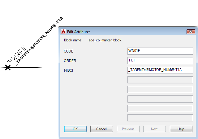 The second one, c:ace_cb_save, saves the TAG1 attribute value on the motor in to memory under an index tag of “@MOTOR_NUM@”. This value can be referenced when the subsequent wire number marker blocks are processed.