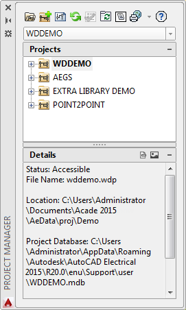 AutoCAD Electrical is a project-based system. An ASCII text with a .wdp extension defines each project. This project file contains a list of project information, default project settings, drawing properties, and drawing file names. You can have an unlimited number of projects; however, only one project can be active at a time.