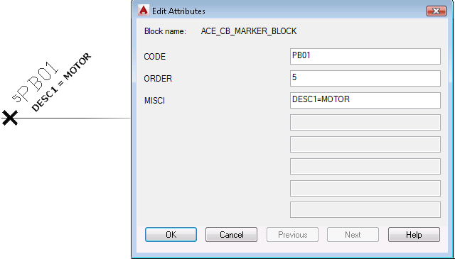 In AutoCAD Electrical, find the marker block that defines the insertion point for the motor symbol. Find the CODE attribute value, for example MTR03.
