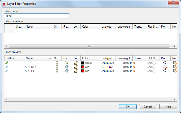 There are two types of layer filters, one based on property settings, and the other a grouping of specified layer names.