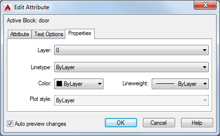 Defines the layer that the attribute is on and the color, lineweight, and linetype for the attribute's line. If the drawing uses plot styles, you can assign a plot style to the attribute using the Properties tab.