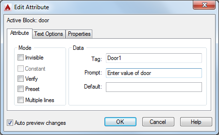 Turns value verification on and off. If selected, prompts you to verify the values you assign to the attribute when inserting a new instance of the block. If this option is cleared, verification is not performed.