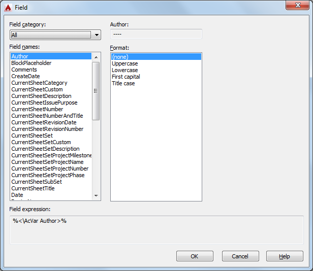 For example, with SheetSet Placeholder selected in the Field Names list, SheetTitle selected in the Placeholder Type list, and Uppercase selected in the Format list, Temporary Value displays SHEETTITLE. When the drawing is placed in a sheet set, this field displays the title of the sheet.