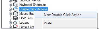 1. In the Customize tab, Customizations In <file name> pane, right-click the Double Click Actions node. Click New Double Click Action.