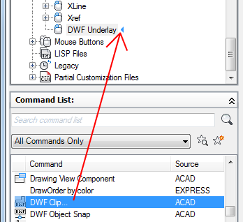 4. In the Command List pane, drag the command you want to add to the double-click action in the Customizations In <file name> pane.