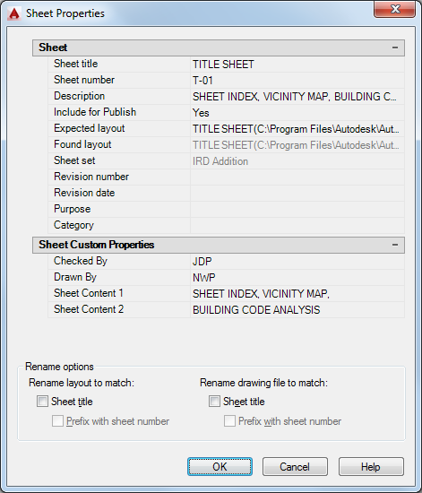 Displays information that is specific to the selected sheet, such as the sheet title, sheet number, and whether it will be included in publishing operations. Also displays custom properties, if any.