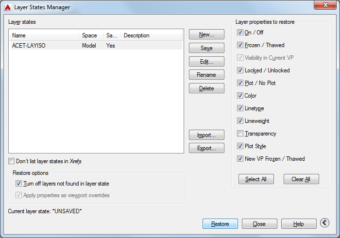 Restores the layer settings saved in the specified layer state, depending on which settings are checked in the Layer Properties to Restore column.