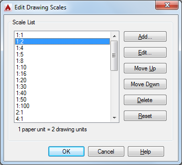 Displays the list of currently defined scales. Also displays temporary scales that are imported when xrefs are attached. If a scale name is duplicated, but has a different value, a number is appended to the name.