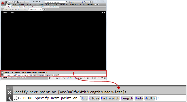 A docked command window is the same width as the application window. It is displayed in a fixed location above or below the drawing area.