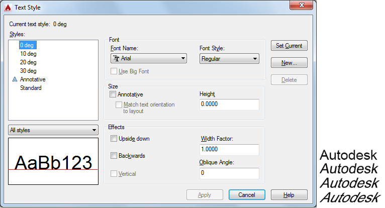 A single font can be used by more than one text style. If your company has a standard font, you can modify other text style settings to create a set of text styles that use this standard font in different ways.