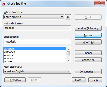Checks the spelling in single-line text, multiline text, multileader text, text within block attributes, text within xrefs, and text added to dimensions.