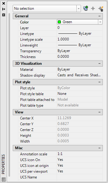 If no objects are selected, the drop-down lists highlighted above display the current settings for the drawing. If you select an object, the drop-down lists display the property settings for that object.