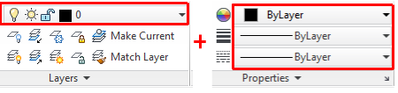 On the Home tab of the ribbon, use the Layers and Properties panels to verify or change the settings for the most commonly accessed properties: layer, color, lineweight, and linetype.