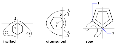 The following illustrations show polygons created using three methods: inscribed, circumscribed, and edge. In each case, two points are specified.
