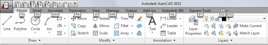 You can use keystrokes instead of the pointing device to make selections on menus, the Quick Access toolbar, and ribbons. To find out which keystrokes are available in the current workspace, press the Alt key.