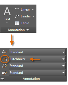 The current dimension style name, Hitchhiker in this case, is displayed in the drop-down list of the Annotation panel.