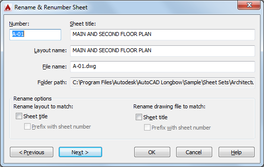When checked, changes the drawing file name to a new name formed by adding the sheet number to the beginning of the sheet title.