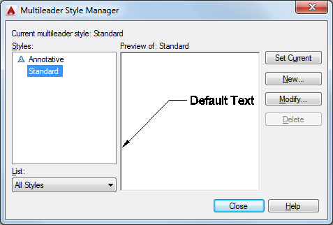 Controls the contents of the Styles list. Click All Styles to display all multileader styles available in the drawing. Click Styles In Use to display only the multileader styles that are referenced by multileaders in the current drawing.