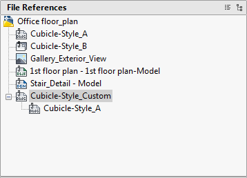 The top level of the tree view always shows the current drawing. Referenced files appear at the next level. Referenced files that contain their own nested file references can be opened to show deeper levels. When making selections in tree view, only one file reference can be selected at a time.