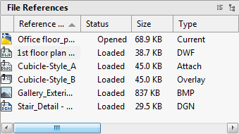 The reference name column always displays the current drawing as the first entry, followed by additional attached files that are listed in the order they were attached.