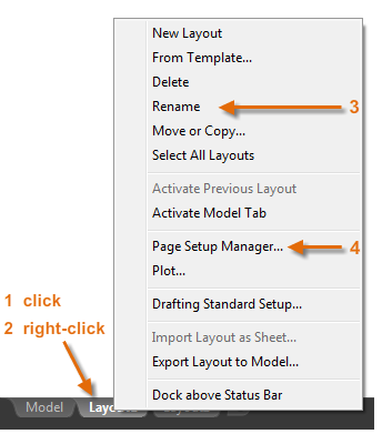 The first thing that you should do when you access a layout tab (1) is right-click the tab (2) and rename it (3) to something more specific than Layout 1. For a D-size layout, ARCH D or ANSI D might be good choices.