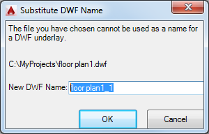 The names of DWF or DWFx references you attach must be unique. Attempts to attach two DWF or DWFx references that have the same name displays the Substitute DWF Name dialog box.