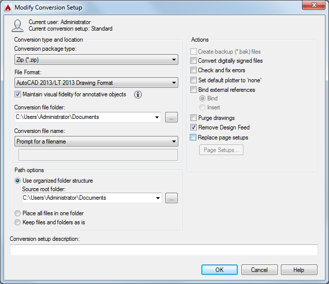 Enter a description for the conversion setup. This description is displayed in the DWG Convert dialog box and the Conversion Setups dialog box below the list of conversion file setups. You can select any conversion setup in the list to display its description.