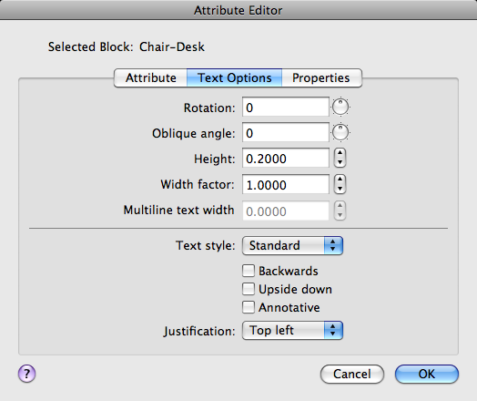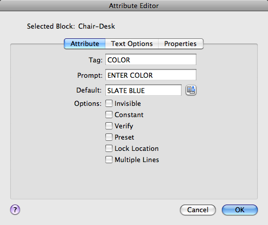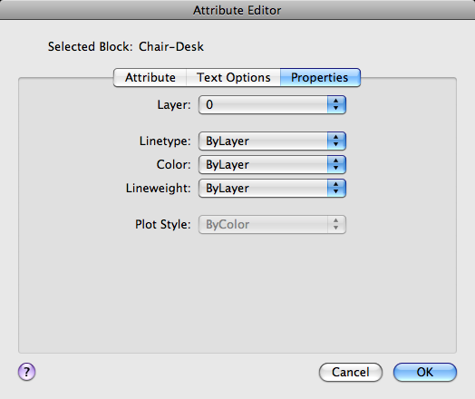 Defines the layer that the attribute is on and the color, lineweight, and linetype for the attribute's line. If the drawing uses plot styles, you can assign a plot style to the attribute using the Properties tab.
