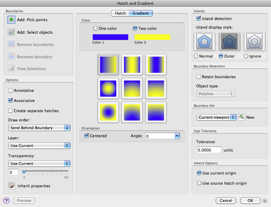 Specifies whether to fill the hatch boundary with a monochormatic or two-color blend.