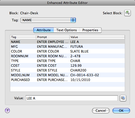 Lists the attributes in the selected block instance and displays the tag, prompt, and value for each attribute.