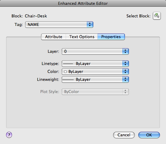 Defines the layer that the attribute is on and the lineweight, linetype, and color for the attribute text. If the drawing uses plot styles, you can assign a plot style to the attribute using the Properties tab.