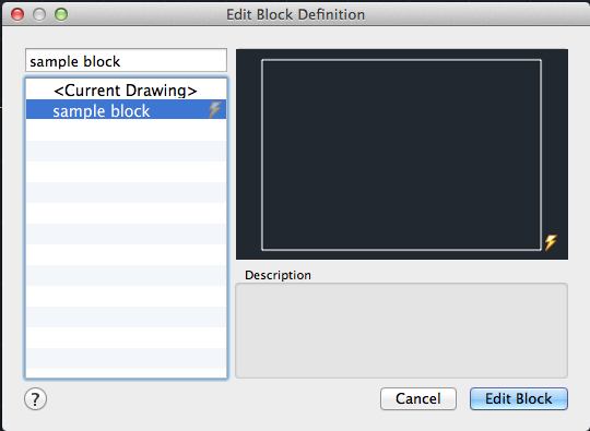 Displays a preview of the selected block definition. A lightning bolt icon indicates that the block is a dynamic block.
