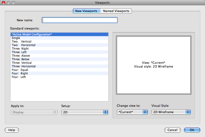 Specifies either a 2D or a 3D setup. When you select 2D, the new viewport configuration is initially created with the current view in all of the viewports. When you select 3D, a set of standard orthogonal 3D views is applied to the viewports in the configuration.