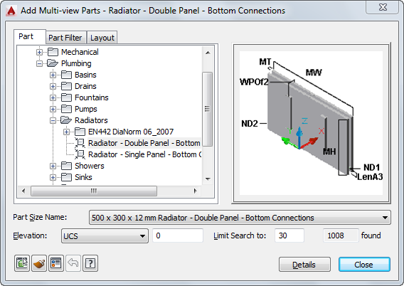 2. Navigate to Plumbing - Radiators in the tree view of the Add Multi-view Parts dialog box, and for Part Size Name, select a part size name from the list.