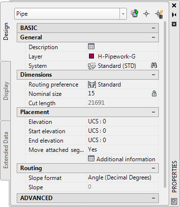 Defines the properties on the Design tab of the Properties palette to use to modify the piping system.