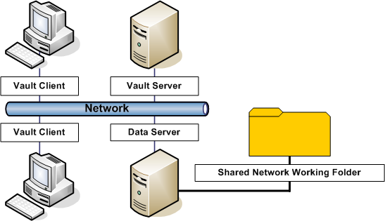When working folders are kept on local computers, as shown in figure 7, it minimizes network traffic and accommodates team members who may work offline from the field or a home office. Users create network traffic only when they check files in or out from the vault.