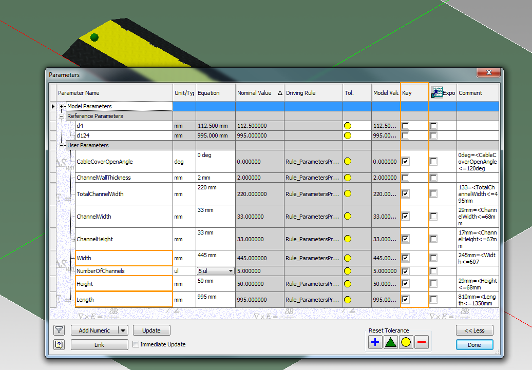 In the following example, the straight asset Cable Cover is used to represent the straight segment of the chain. The Width, Height and Length parameters of the model are mandatory and must be set as Key Parameters in Inventor. When populating the 2D asset chains with their Inventor 3D equivalents, the Model Key Parameter receives the value from the mapped Segment Parameter Name to create asset components within Inventor.