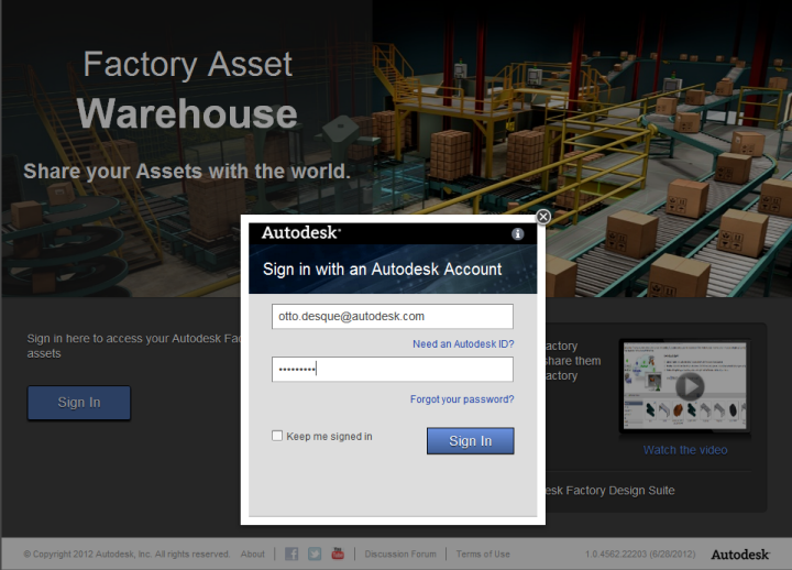 Go to the Factory Asset Warehouse: Factory Asset Warehouse. If you are a current Autodesk user, just use your existing credentials to sign in to Factory Asset Warehouse.